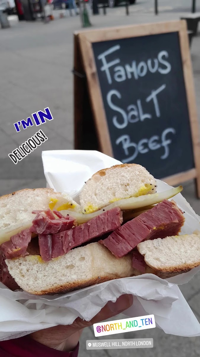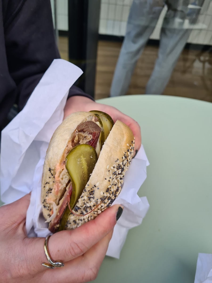 Absolute top bagel. I had the Reuben in an onion bagel. Generous and very tasty. Perfect salt beef, not too fatty or greasy. Left to my own devices I would have smuggled in a couple of extra pickles but, hey, that's how I roll. Great service from lovely staff